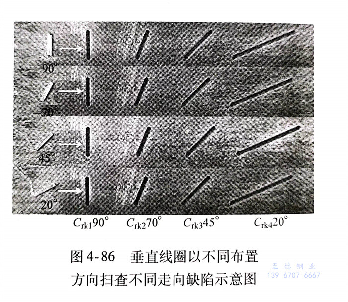 在实际生产过程中,当生产工艺参数确定后,同批钢管中自然缺陷走向往往大致相同。如图4-89所示,设钢管中存在斜向缺陷1,并与磁化场方向形成夹角ao,由于在物料运输过程中可能出现钢管方向倒置,因此,斜向缺陷走向也可能会与磁化场方向形成夹角ππ-α0,如斜向缺陷3。对此,在探头内部布置多向性阵列感应线圈S1、S2和S3,分别与磁化场形成夹角a1、α2和α3其中,第一排阵列感应线圈S,对斜向缺陷1进行扫查,根据水平线圈敏感方向与缺陷走向夹角对检测信号幅值的影响规律,线圈敏感方向应该与缺陷1走向平行,即α1=α0;第二排阵列感应线圈S2用于检测标准垂直缺陷2和校验设备状态,因此线圈敏感方向与磁化方向垂直,即a2=90°第三排阵列感应线圈S3方向与缺陷3走向平行,即α3=π-α0。