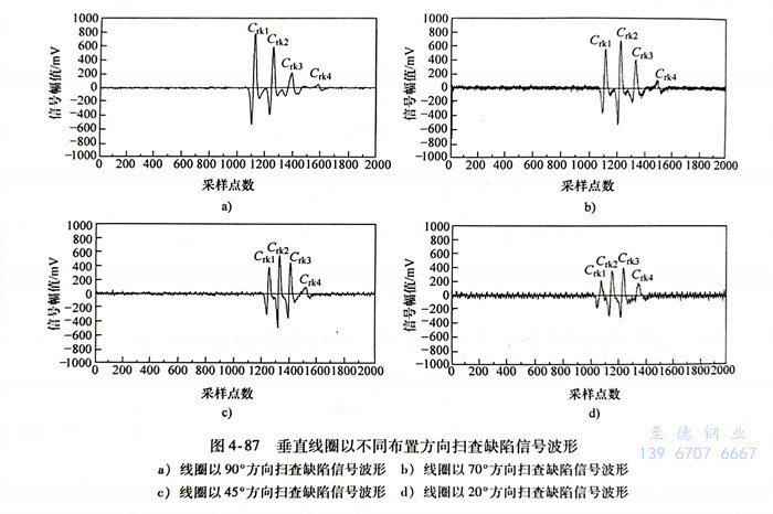 从图4-87中可以看出,当垂直线圈以不同布置方向扫查四个缺陷时,检测信号变化规律与水平线圈相同:当垂直线圈以90°方向依次扫过四个缺陷时,检测信号依次减小,其中C,k1缺陷信号幅值最大,C4缺陷信号幅值最小;当垂直线圈以70°方向依次扫过四个缺陷时,缺陷信号幅值最大,C信号幅值次之,然后依次为Ck3和C4k4;当垂直线圈以45°方向依次扫过四个缺陷时,C,k3缺陷信号幅值明显增加,C,k4信号幅值有所增加,而Ck1和Ck2信号幅值均降低;当垂直线圈以20°方向依次扫过四个缺陷时,Crk4缺陷信号幅值增加,其余三个缺陷信号幅值都降低,而且Ck1、Crk2和Crk3信号幅值依次由小到大排列。