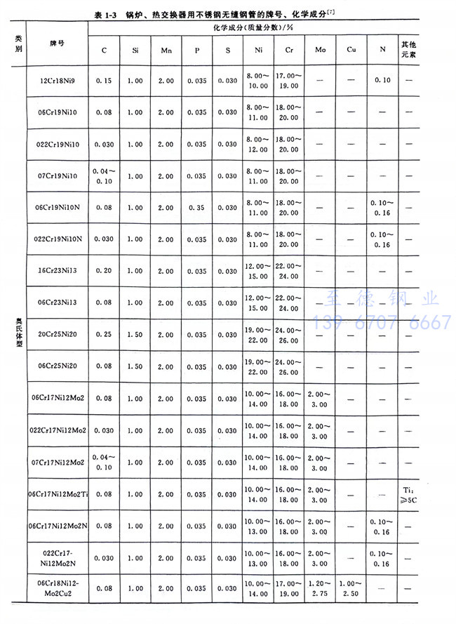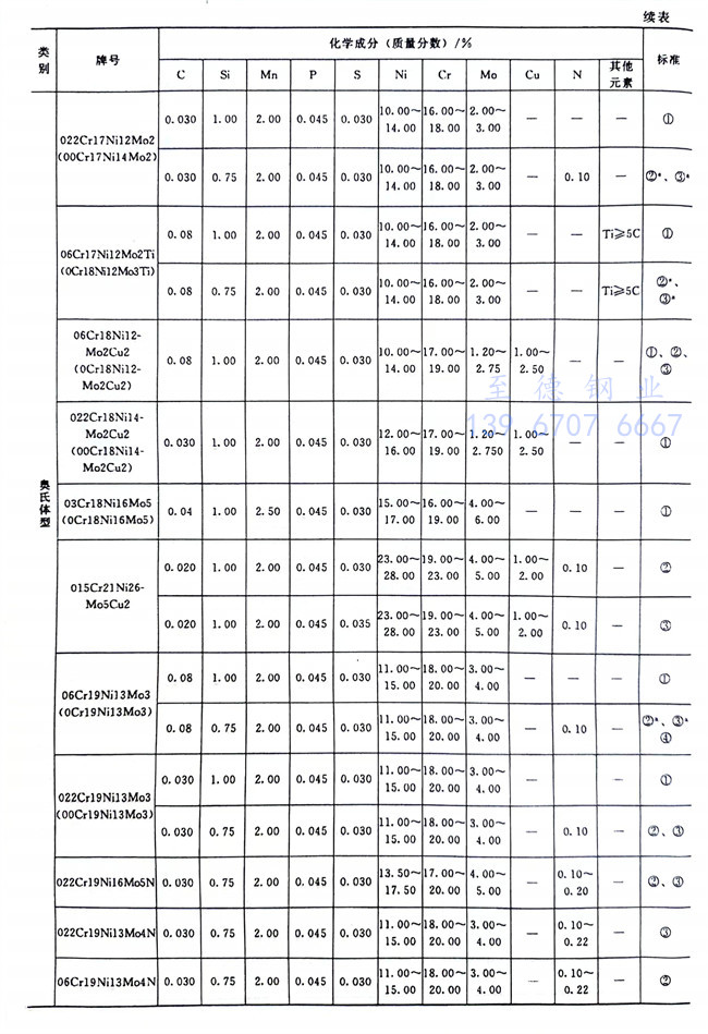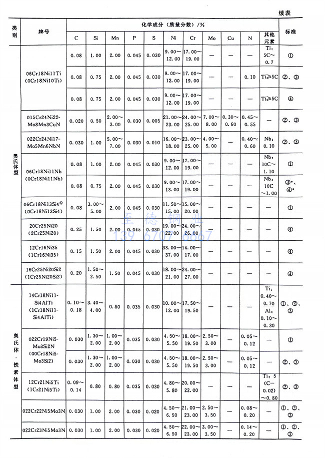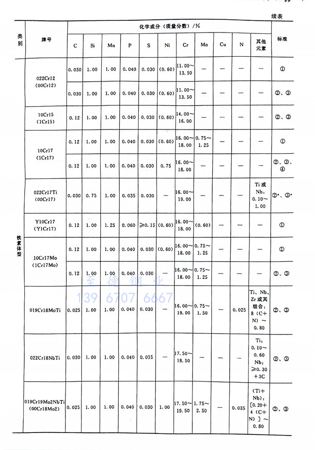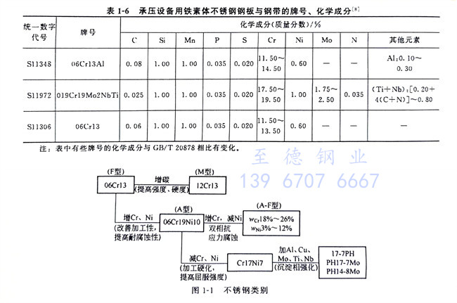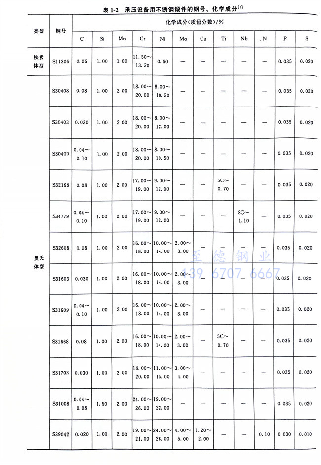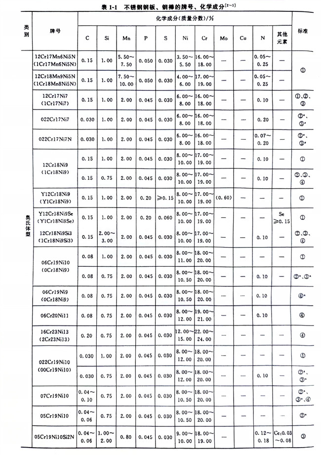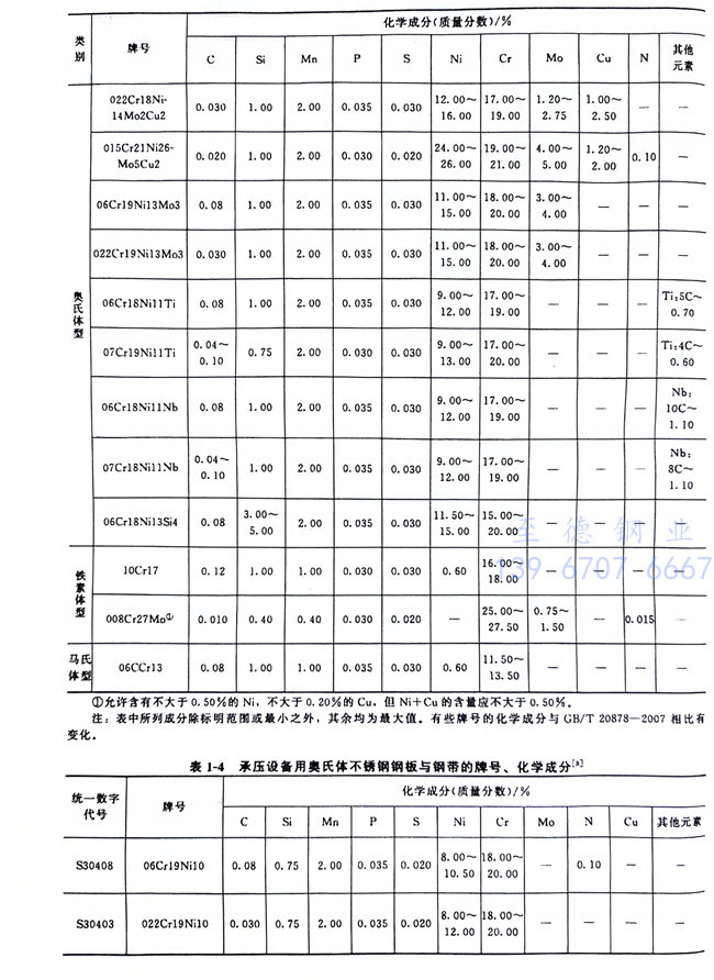 我国至少已制定了62项不锈钢管材料标准(其中国家标准38项,冶金行业标准16项,航空航天标准6项、机械行业标准1项、能源局标准1项),每个标准均规定了材料的化学成分、力学性能等技术要求。在机械工程上应用最多的不锈钢材料与标准包括GB/T3280-2007《不锈钢冷轧钢板和钢带》(该标准正在修订中)、GB/T 4237-2007《不锈钢热轧钢板和钢带》(不得用于锅炉压力容器制造,该标准正在修订中)和GB/T 4238-2007《耐热钢钢板和钢带》、GB 24511-2009《承压设备用不锈钢钢板及钢带》、NB/T 47010-2010(JB/T 4728)《承压设备用不锈钢和耐热钢锻件》,常见的不锈钢牌号、化学成分和类别,见表1-1~表1-6。