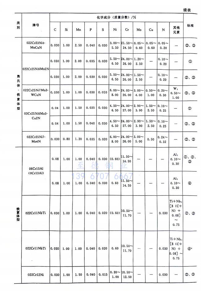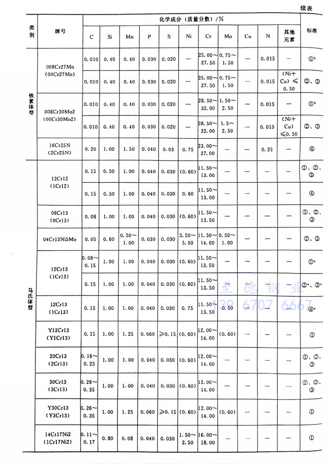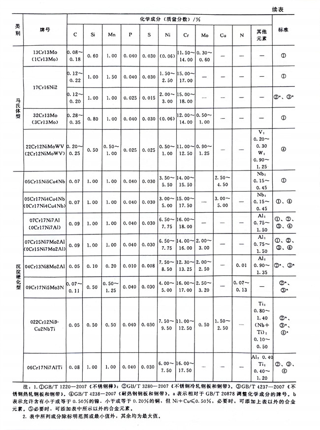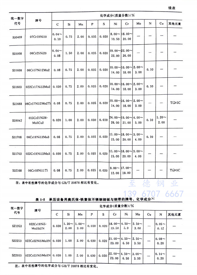 从表1-1~表1-6、表1-8可以看到,不锈钢和耐热钢相互之间的许多牌号的化学成分、力学性能等是相同的,这些牌号的材料既可作为不锈钢使用,也可作为耐热钢使用。