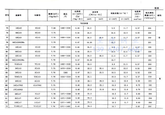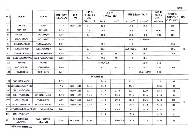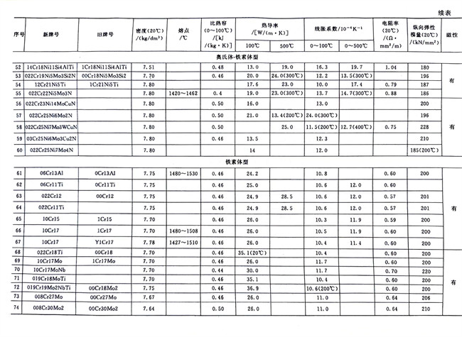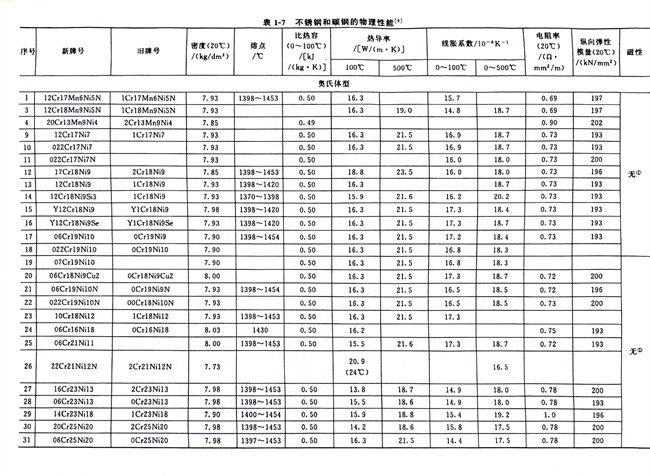 不锈钢和碳钢的物理性能数据对照见表1-7。从表中可知,碳钢的密度略高于铁素体型和马氏体型不锈钢,而略低于奥氏体型不锈钢;电阻率按碳钢、铁素体型、马氏体型和奥氏体型不锈钢排序依次递增;线胀系数大小的排序也类似,奥氏体型不锈钢最高而碳钢最小;碳钢、铁素体型和马氏体型不锈钢有磁性,奥氏体型不锈钢无磁性,但其冷加工硬化生成马氏体相变时将会产生磁性,可用热处理方法来消除这种马氏体组织而恢复其无磁性。