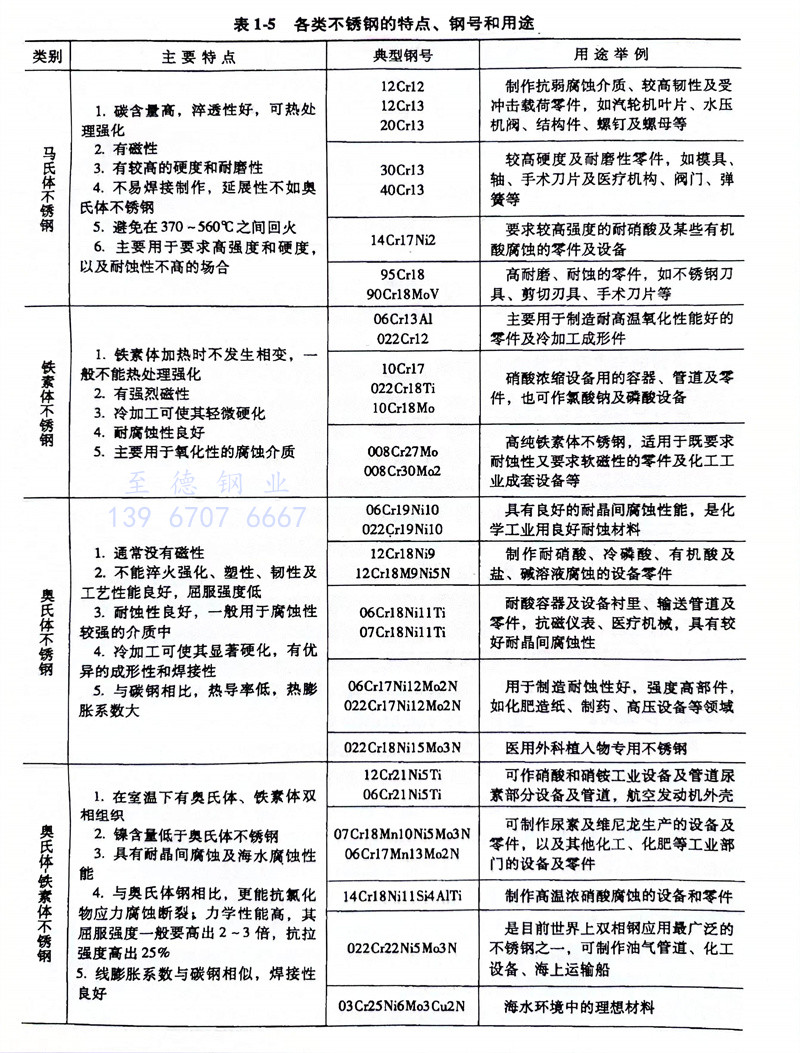 不锈钢的类别主要有马氏体不锈钢、奥氏体不锈钢、铁素体不锈钢、奥氏体-铁素体双相不锈钢以及沉淀硬化型不锈钢。bb708电子游戏娱乐本次节主要介绍各类不锈钢的特性、特点以及典型钢号的用途。其中,马氏体不锈钢、奥氏体不锈钢、铁素体不锈钢、奥氏体-铁素体双相不锈钢的主要特性比较见表1-4,各类不锈钢的特点、钢号和用途见表1-5。