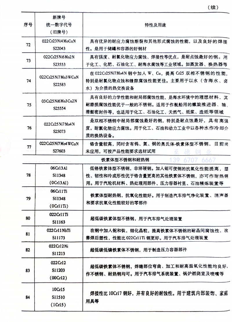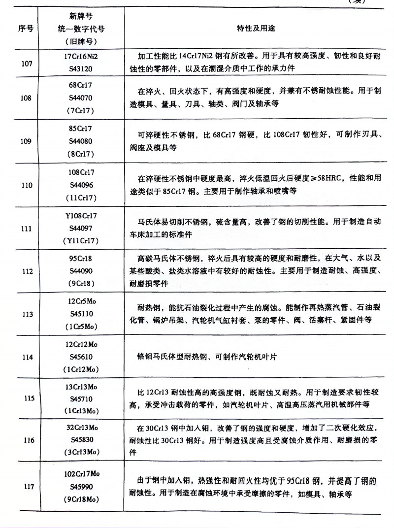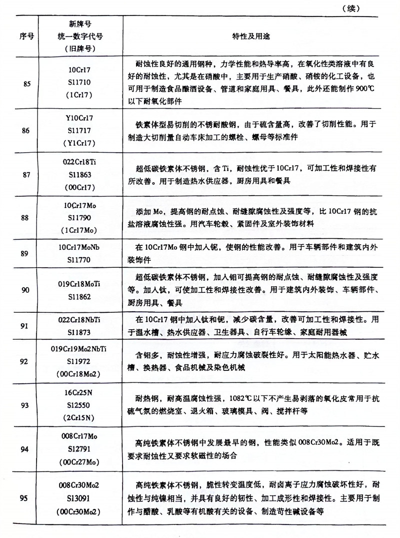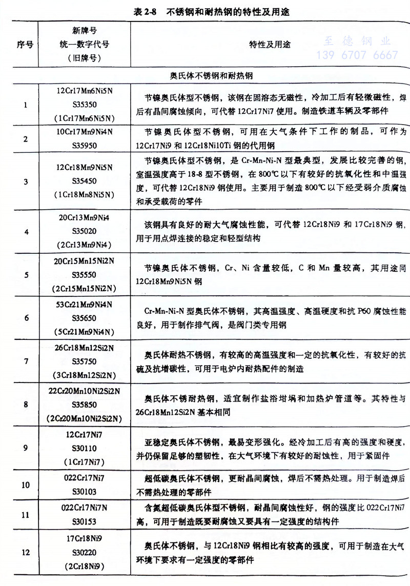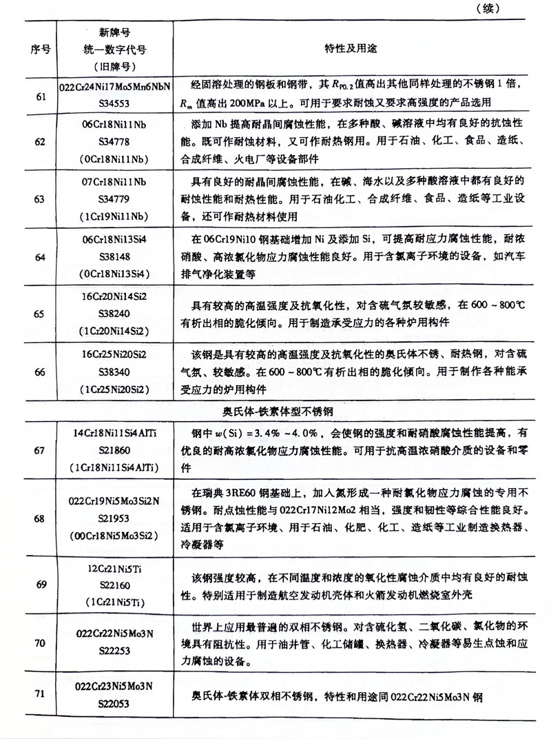 不锈钢的选择在大的方面可根据前面的方法选用。对于具体选择哪一种不锈钢,还应根据每一个不锈钢钢种的基本特性和相关因素来选择适合生产需要、经济上合理、技术上先进的不锈钢。下面简要介绍各类不锈钢使用特性对比(见表2-7)、以及每种不锈钢和耐热钢的特性和用途(见表2-8),供选择时参考。