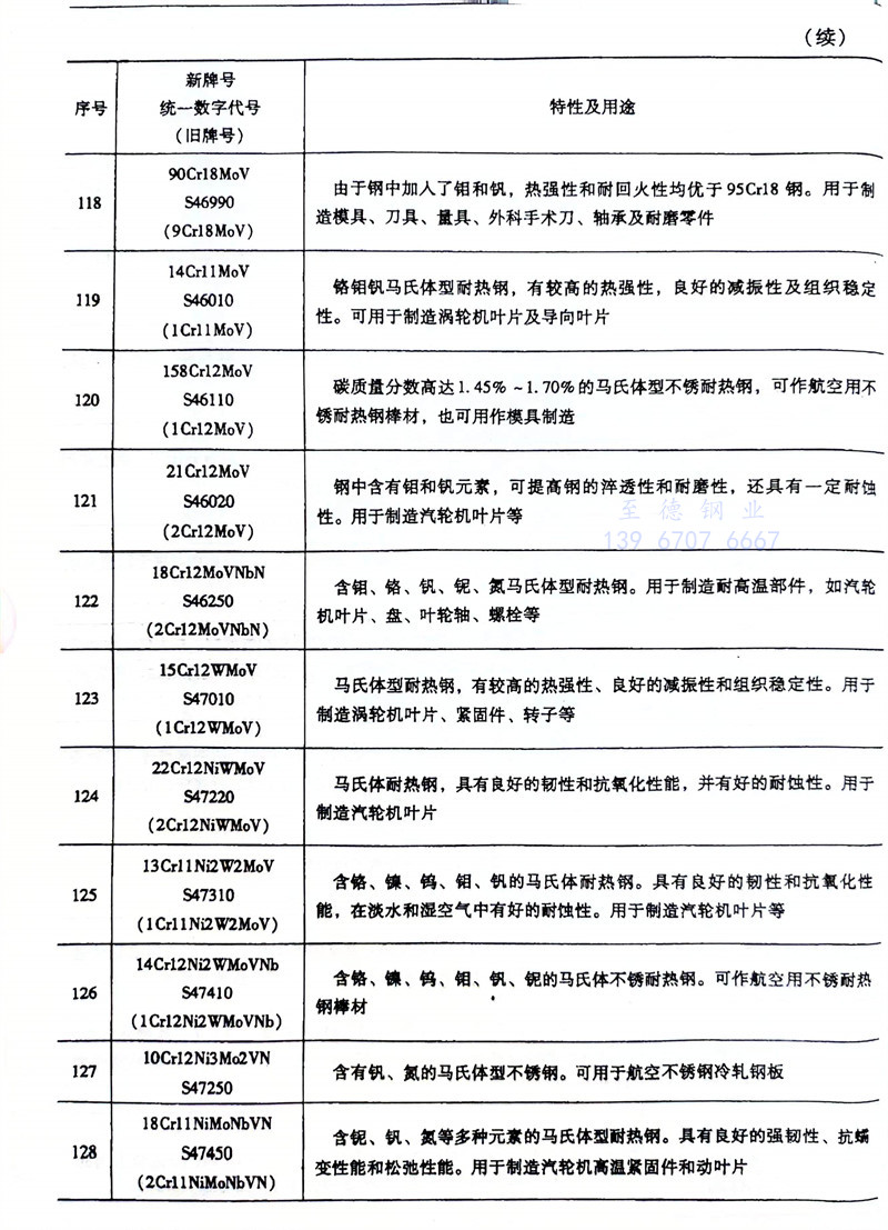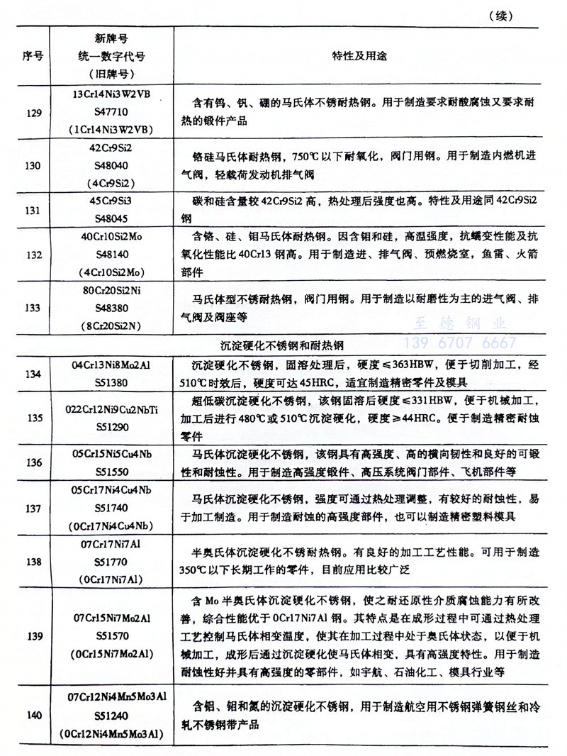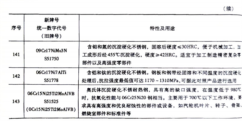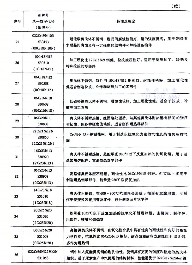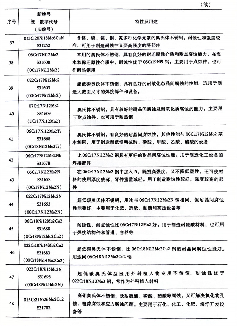 不锈钢的选择在大的方面可根据前面的方法选用。对于具体选择哪一种不锈钢,还应根据每一个不锈钢钢种的基本特性和相关因素来选择适合生产需要、经济上合理、技术上先进的不锈钢。下面简要介绍各类不锈钢使用特性对比(见表2-7)、以及每种不锈钢和耐热钢的特性和用途(见表2-8),供选择时参考。