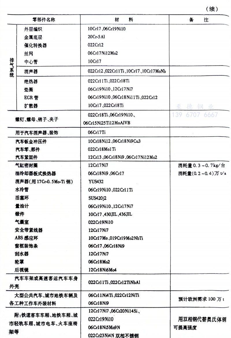 当前汽车工业的技术发展面临着四大挑战,即减少污染、节约能源、降低成本和安全措施。在汽车尾气排放中采用强制性控制措施,不锈钢在排气系统上得到应用。国际上现代轿车发动机的排气系统都采用不锈钢制造,其中80%为铁素体不锈钢(022Cr12、022Cr11Ti、10Cr15、10Cr17、019Cr19Mo2NbTi等)制造,每辆车大约使用不锈钢23~25kg;按每年生产200万辆车计算,铁素体不锈钢年消耗量为5万吨。汽车上其他零件,如消声器、紧固件、冲压件以及一些零部件都需要用不锈钢制造。其应用情况见表2-12。