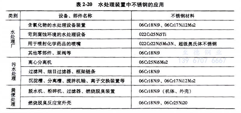 在城市和工厂的污水处理过程中,由于水中的杂质以及加入的化学物质将会对水处理设备产生腐蚀。为了延长污水处理设备的使用寿命,也多采用不锈钢制造,见表2-20。