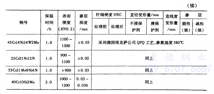 该工艺与QPQ工艺、商业盐J-2、TF-1工艺相同。气门经低温无毒盐浴共渗(500℃×3h)和氧化复合处理(在160℃的氧化剂中保温20min)后,其耐蚀性和外观质量优异,硬度均在50HRC以上,变形小。内燃机气门500℃液体软渗氮后的测定结果见表3-20。