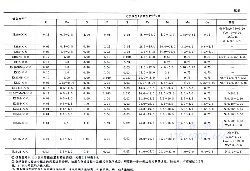 焊条型号是国家标准中对焊条规定的编号,GB/T 983-2012《不锈钢焊条》根据焊条熔敷金属的化学成分、焊接位置和药皮类型、焊接电流种类规定了不锈钢焊条型号的编排方法(与美国焊接学会标准AWS A5.4M:2006《耐蚀铬钢及铬镍钢焊条》焊条型号的编号方法类似)。不锈钢焊条型号及熔敷金属化学成分见表2-1,焊条型号中的焊接位置、药皮类型和焊接电流种类的编号方法见表2-2、表2-3。不锈钢焊条的技术要求、性能指标、检验方法应符合GB/T 983-2012《不锈钢焊条》标准的规定。用于承压特种设备的不锈钢焊条还应符合NB/T 47018.2-2011(JB/T 4747)《承压设备用焊接材料订货技术条件 第2部分:钢焊条》的规定。