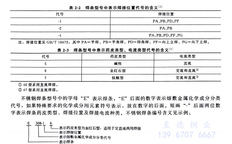 不锈钢焊条型号中的字母“E”表示焊条,“E”后面的数字表示熔敷金属化学成分分类代号,如果特殊要求的化学成分用元素符号表示,放在数字的后面。短画“-”后面两位数字表示焊条药皮类型、焊接位置及焊接电流种类。不锈钢焊条编号含义见示例: