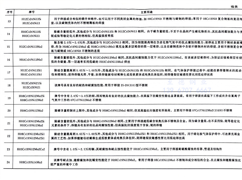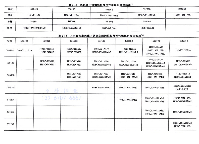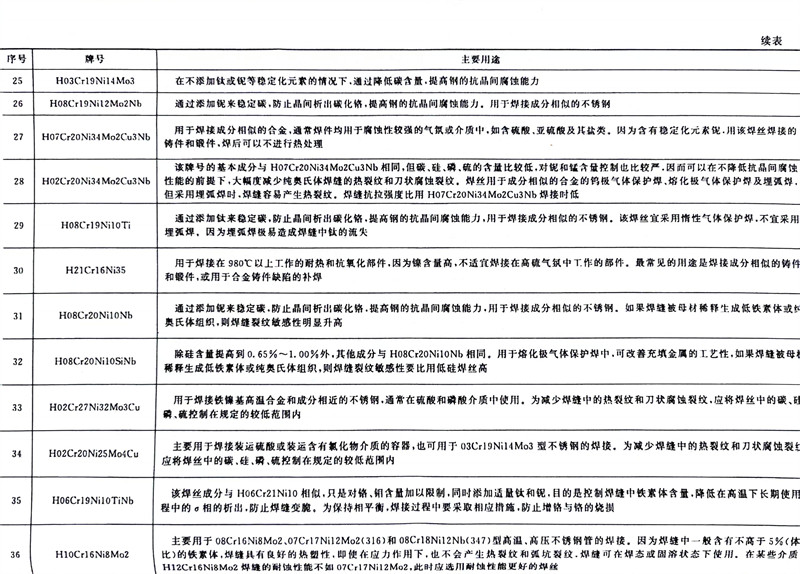 惰性气体保护焊接时焊接区的金属不会被氧化,所以焊丝熔化后化学成分基本不变,即焊缝金属的化学成分就是焊丝的化学成分。焊接时要选择与母材化学成分接近的焊丝,焊丝的化学成分见表2-17,不锈钢压力容器焊接用实心焊丝的选用见表2-18、表2-19。各牌号实心不锈钢焊丝的主要用途见表2-20。非重要件焊接用焊丝可从不锈钢母材截取板条作填充材料。对钢棒直径、钢丝直径和钢丝盘内径均有一定的要求,分别见表2-23~表2-25。其中钢丝直径和钢丝盘内径是气体保护熔化极焊接方法提出的特殊要求。钢棒长度为1000mm,允许正偏差≤50mm。钢丝应规整,不得散乱或成“o”字形。
