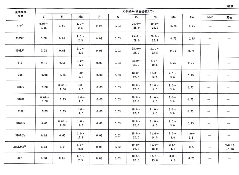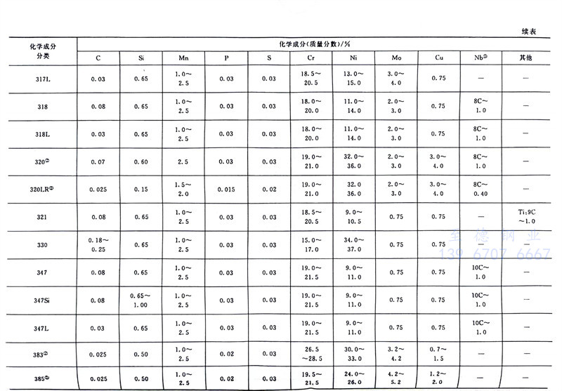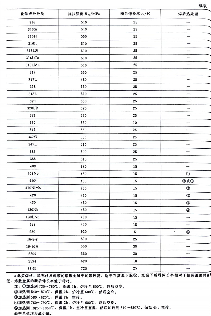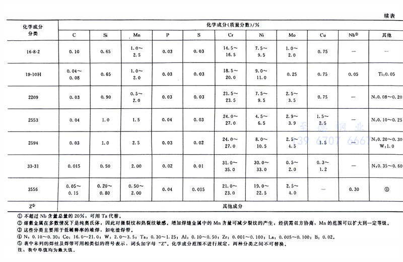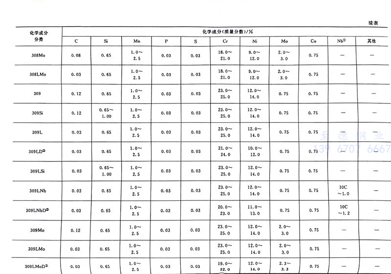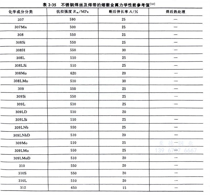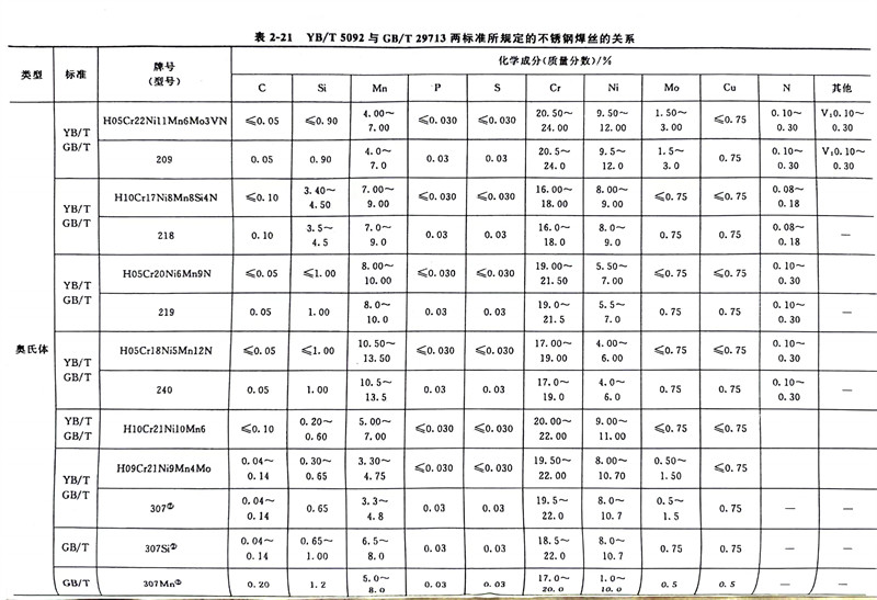 GB/T 29713-2013《不锈钢焊丝和焊带》标准规定的不锈钢焊丝及焊带的化学成分与YB/T 5092-2005《焊接用不锈钢焊丝》规定的焊丝的化学成分非常接近。它们之间的详细对比见表2-21。GB/T 29713-2013标准适用于熔化极气体保护电弧焊、非熔化极气体保护电弧焊、埋弧焊、电渣焊、等离子弧焊及激光焊等用不锈钢焊丝、填充丝及焊带。该标准规定的焊丝、焊带化学成分见表2-34(该表列出的为焊丝型号、该标准的焊丝与焊带的化学成分一致),力学性能参见表2-35。
