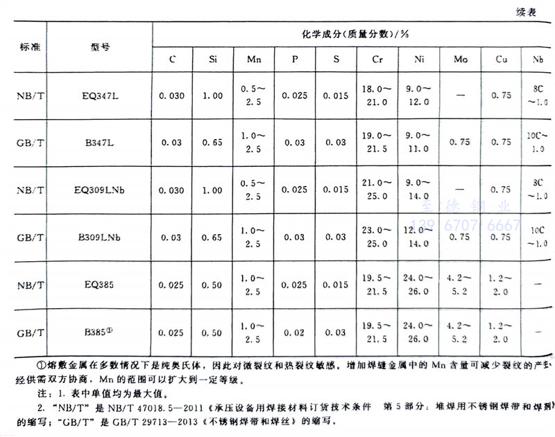 NB/T 47018.5-2011标准对S、P含量的限制严于GB/T 29713-2013标准。NB/T 47018.5-2011标准焊带Mo含量上限普遍低于GB/T 29713-2013标准要求。NB/T 47018.5-2011标准规定的焊带与GB/T 29713-2013标准规定的焊带之间的关系见表2-38。通过表2-38的数据可得知两标准的焊带化学成分比较接近(邻近的焊带牌号),但没有完全符合的焊带。