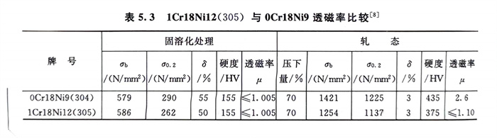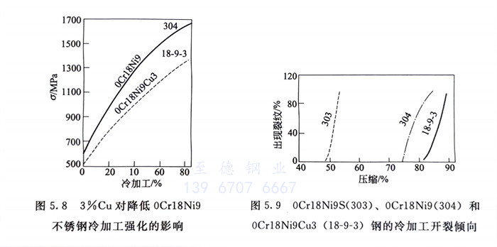 1Cr18Ni12和0Cr18Ni9Cu3,前者是通过提高1Cr18Ni9钢的镍含量,使奥氏体更加稳定,经较大冷变形后,可基本上不产生马氏体相变,既可使钢的冷加工硬化倾向小,更易于冷加工成型,减少中间退火次数。同时,由于固溶态与轧态的透磁率变化很小(表5.3),较0Cr18Ni9(304)更适于无磁用途。而0Cr18Ni9Cu3则系加入铜使奥氏体更加稳定,冷加工过程转变为马氏体的敏感性降低,从而使钢的冷作硬化倾向和冷作速率以及冷开裂敏感性下降,使此钢在较小变形力作用下可获得最大的冷变形,因此,0Cr18Ni9Cu3更适于紧固件和深冲、深拉等用途。图5.8和图5.9系一些试验结果。