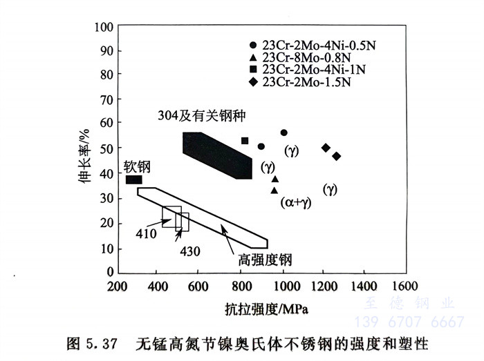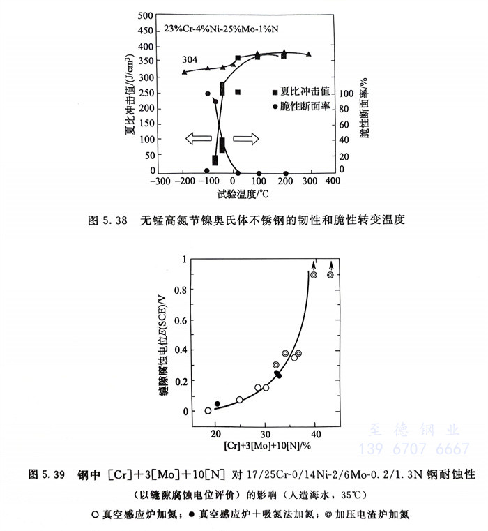 从图5.38可知,它们虽然有脆性转变温度,但可低到-50℃,同时,室温韧性良好,且与18-8铬镍奥氏体不锈钢相当。
