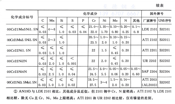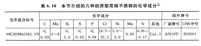 经济型双相不锈钢系指现代双相不锈钢中低镍无钼和少钼的那些牌号,其中的几个主要牌号及其化学成分列入表6.10中。除00Cr23Ni4N(SAF 2304)外,多种经济型双相不锈钢管都是2000年以来陆续面世的。例如,AN19D (00Cr20Mn5Ni1.5N),LDX 2101 (00Cr21Mn5Ni1.5N),ATI 2101(00Cr21Mn2.5Nil.5N), ATI 2201 (00Cr22Nil.5N),UR 2202(00Cr22Ni2N),SAF 2404和 ATI 2003 (00Cr21Ni3.5Mo1.5N)等,本节仅对表6.10中所列牌号进行扼要介绍。