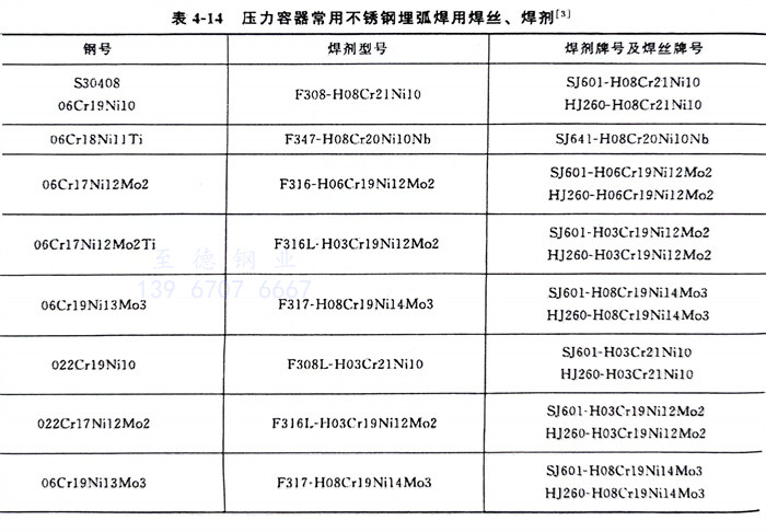 a. 压力容器常用不锈钢埋弧焊焊丝、焊剂见表4-14,常用奥氏体型耐热钢埋弧焊焊剂与焊丝见表4-15,结构件常用奥氏体不锈钢埋弧焊焊剂与焊丝见表4-16。