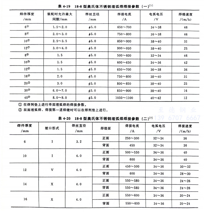 上述各项焊接参数的选择,不能单项考虑,要有机地匹配,进行综合平衡分析,找出一个主要焊接参数,在充分试验后,才能制订出最佳参数。最终要经过焊接接头的力学性能考核和耐腐蚀性能试验(即焊接工艺评定合格),满足产品设计图样要求后,方能在产品上正式施焊。表4-19、表4-20所列出的18-8型奥氏体不锈钢焊接参数可供参考。