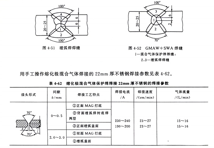 用手工操作熔化极混合气体焊接的22mm厚不锈钢焊接参数见表4-62。
