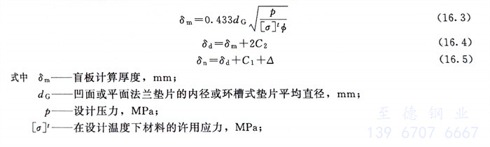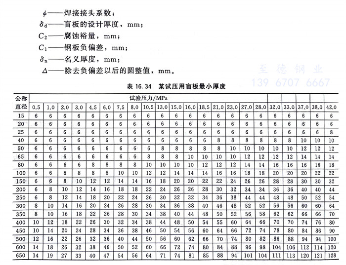 夹在两法兰之间的盲板,其计算厚度可按式(16.3)确定。用整体钢板制造时,式中焊接接头系数等于1.0。对于永久性盲板应按式(16.5)增加厚度附加量。某试压用盲板最小厚度见表16.34。