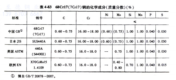 68Cr17(7Cr17)、1.4109、S44002、440A不锈钢的化学成分见表4-83。