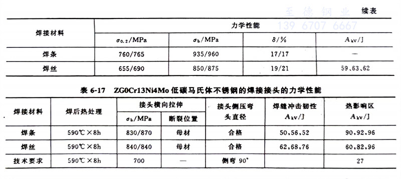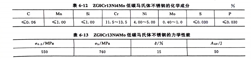 表6-12 ZG0Cr13Ni4Mo低碳马氏体不锈钢的化学成分,表6-13 ZG0Cr13Ni4Mo低碳马氏体不锈钢的力学性能
