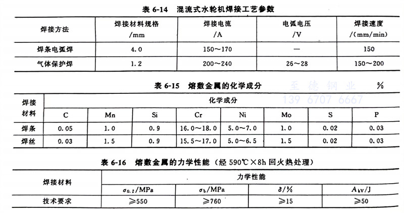 焊接材料:Cr16-Ni5-Mo1合金体系的HS367L焊丝及配套焊条,熔敷金属的化学成分和力学性能分别列于表6-15和表6-16,接头的力学性能列于表6-17。