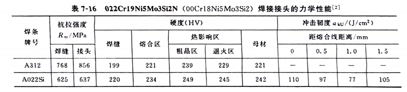 GTAW和GMAW法焊接时,填充焊丝可采用母材金属,也可选用H03Cr19Ni12Mo2和00Cr20Ni14Mo3焊丝。应采用小直径焊丝和小热输入进行施焊。GTAW和GMAW法焊接时,采用3RS63焊丝,焊缝中铁素体所占的比例为15%~20%,能得到与母材相匹配的力学性能和耐腐蚀性能。采用焊条电弧焊时,3RE60-PW、A022Si、超低碳A312焊条都可使用,其焊缝金属同于采用3RS63焊丝气保护焊接。以上焊接材料其熔敷金属的化学成分见表7-15。选用A312和A022Si牌号的焊条焊接 022Cr19Ni5Mo3Si2N(00Cr18Ni5Mo3Si2)钢时,其焊接接头的力学性能见表7-16。