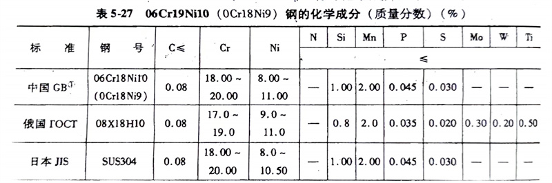 (1)化学成分: 06Cr19Ni10 、0Cr18Ni9、1.4301、S30408、304不锈钢的化学成分见表5-27。