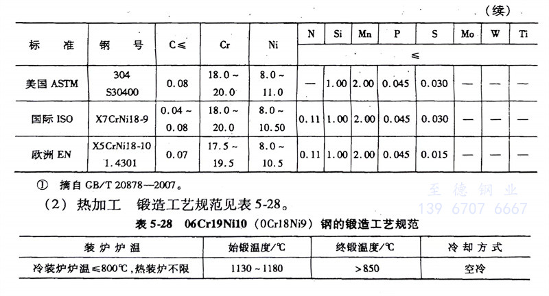 (2)热加工: 06Cr19Ni10 、0Cr18Ni9、1.4301、S30408、304不锈钢锻造工艺规范见表5-28。