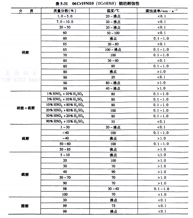 (7)耐蚀性: 06Cr19Ni10 、0Cr18Ni9、1.4301、S30408、304不锈钢的耐蚀性见表5-31。
