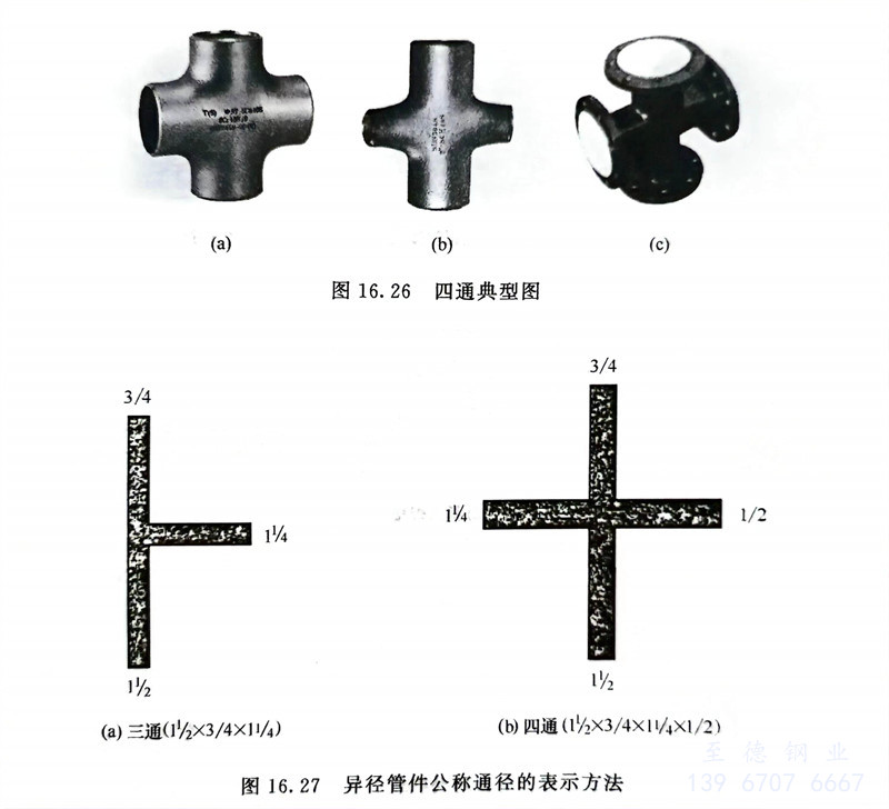 ⑤. 对于异径三通,首先给出最大端的公称通径,然后是与最大端相对应的那一端的公称通径,最后给出支管端的公称通径;对于异径四通,首先给出最大端的公称通径,其次是与最大端相对应的另一端的公称通径,第三个给出的是另外两端中较大端的公称通径,最后给出剩余一端的公称通径,见图16.27。
