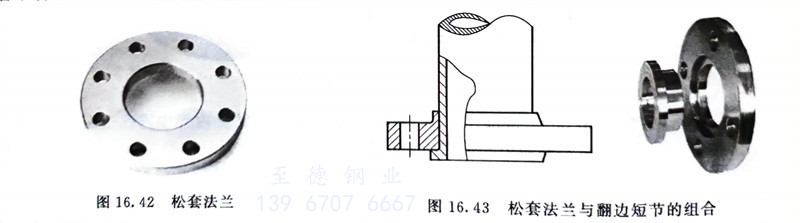 常用于介质温度和压力都不高而介质腐蚀性较强的情况。松套法兰一般与翻边短节组合使用(图16.43),即将法兰圈松套在翻边短节外,管子与翻边短节对焊连接,法兰密封面(凹凸面、榫槽面除外)加工在翻边短节上。此外,还有平焊环和对焊环板式松套法兰。由于法兰本身不与介质相接触,只要求翻边短节或焊环与管材一致,法兰本体的材质完全可与管材不同,因而尤其适用于腐蚀性介质管道上,可以节省不锈钢、有色金属等贵重耐蚀材料。
