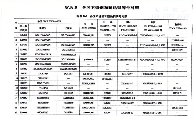 中国GB标准不锈钢和耐热钢牌号及化学成分表
