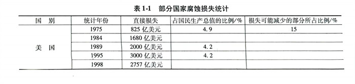 腐蚀造成的直接经济损失可以统计出具体数字。据发达国家统计,每年由腐蚀造成的直接经济损失约占国民经济总产值的1%~6%,超过了每年因水灾、火灾、风灾和地震造成的损失总和(100多亿美元)。据权威部门统计,我国每年因腐蚀造成的损失高达5000多亿元,相当于国民生产总值的4%,仅在石油和化学工业造成的损失就达800多亿元。据统计,全世界每年由于腐蚀而报废的金属设备和材料相当于金属年产量的10%~40%,其中2/3 可再生,而1/3的金属材料被腐蚀后无法回收。从表1-1可以看出发展中国家与发达国家由腐蚀造成的损失都相当大。