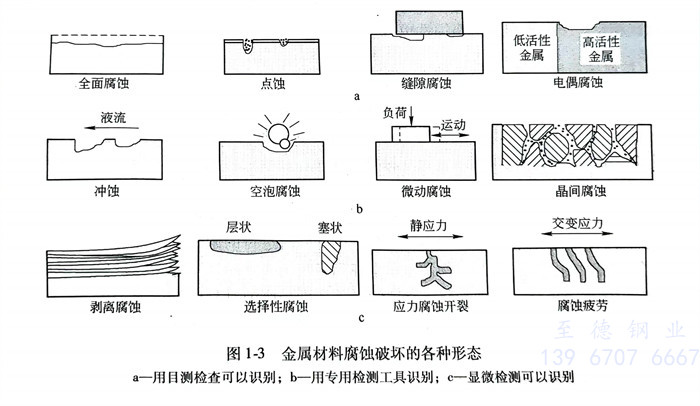 图1-3给出了主要腐蚀破坏的形态特征示意图。第一类目测检查可以识别,见图1-3a,第二类用专用检测工具识别,见图1-3b,第三类显微检测可以识别,见图 1-3c。